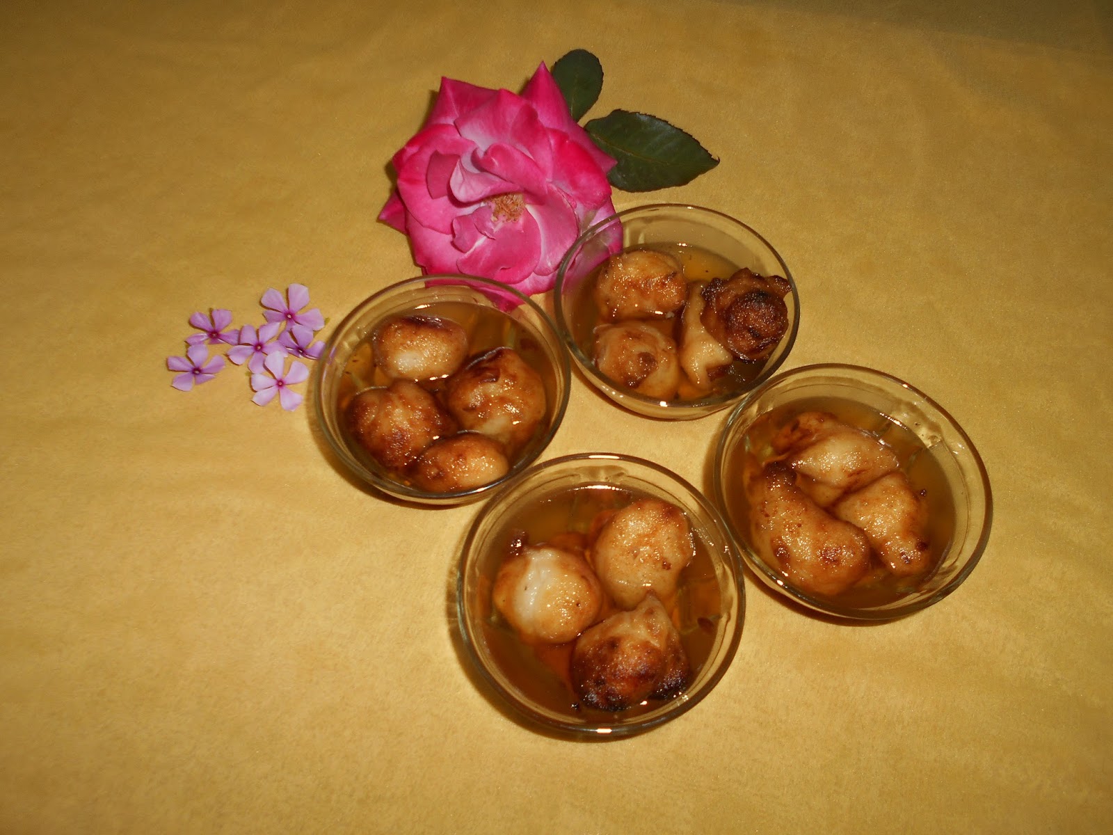 5. Step - 5 , Take a wok . Then add 1 cup water and 1 cup sugar . Mix it very well . Bring to boil on high heat stirring till sugar is dissolved . Then boil for 5 minutes . When sugar is medium thicken . Switch off the flame . Now add Biulir Daler Bora or Rosbora . Mix Well . Keep aside Rosbora / Biulir Daler Bora in syrup for at least 1 - 2 hours .